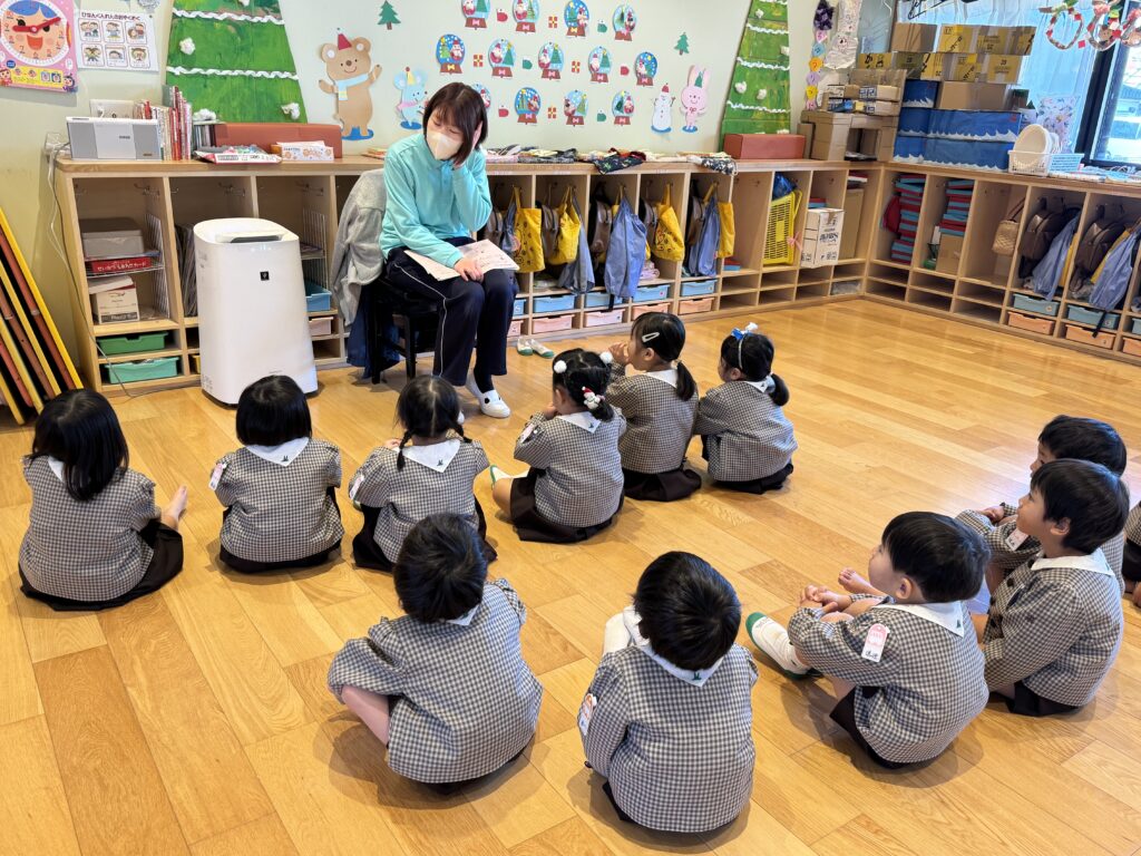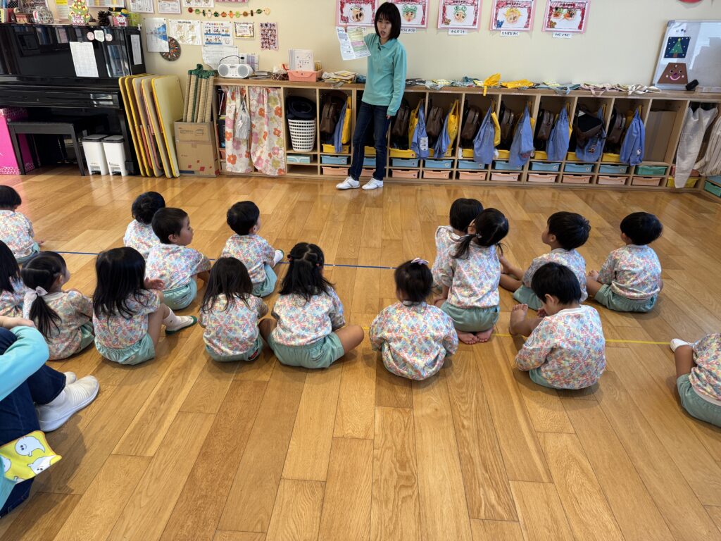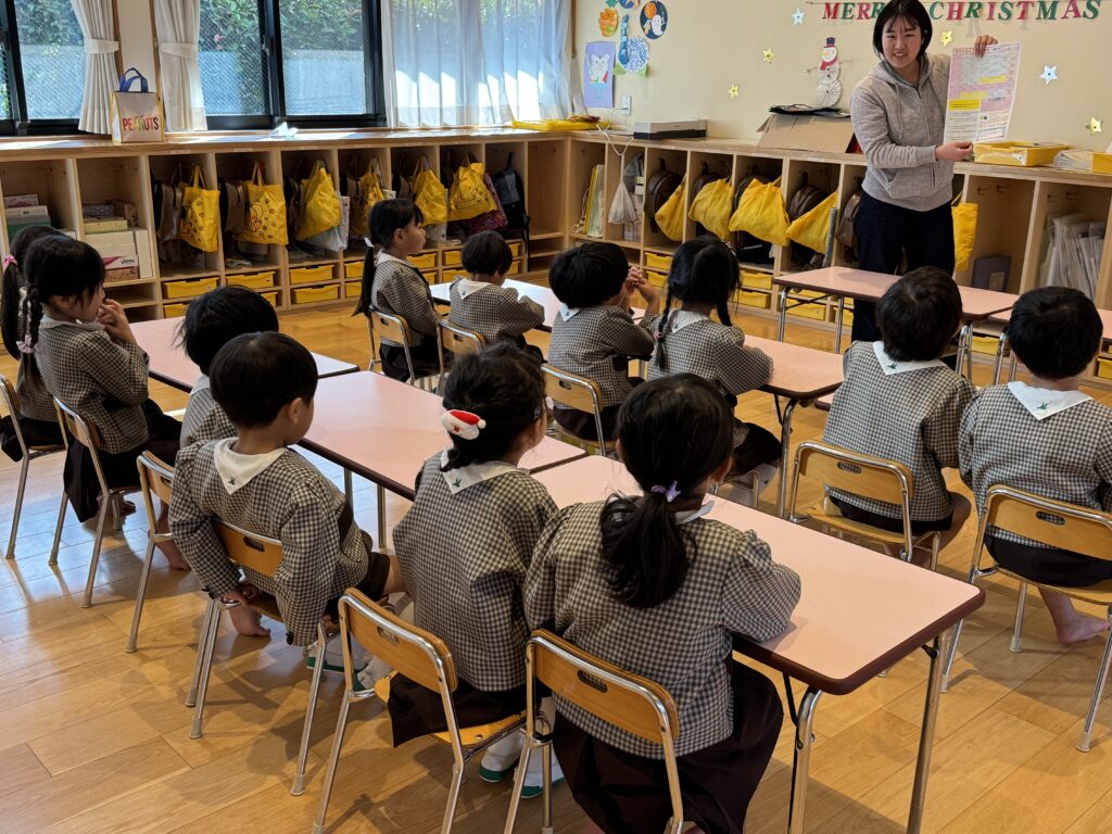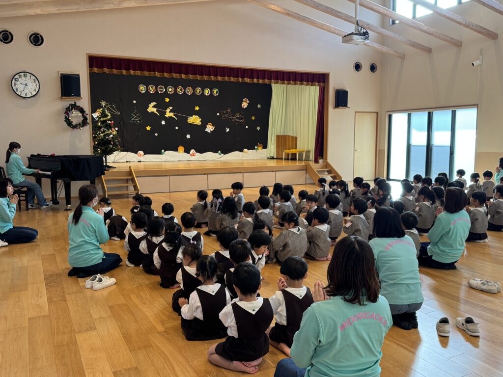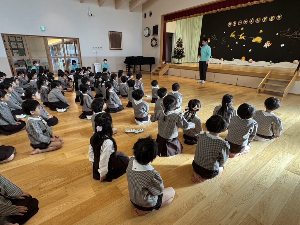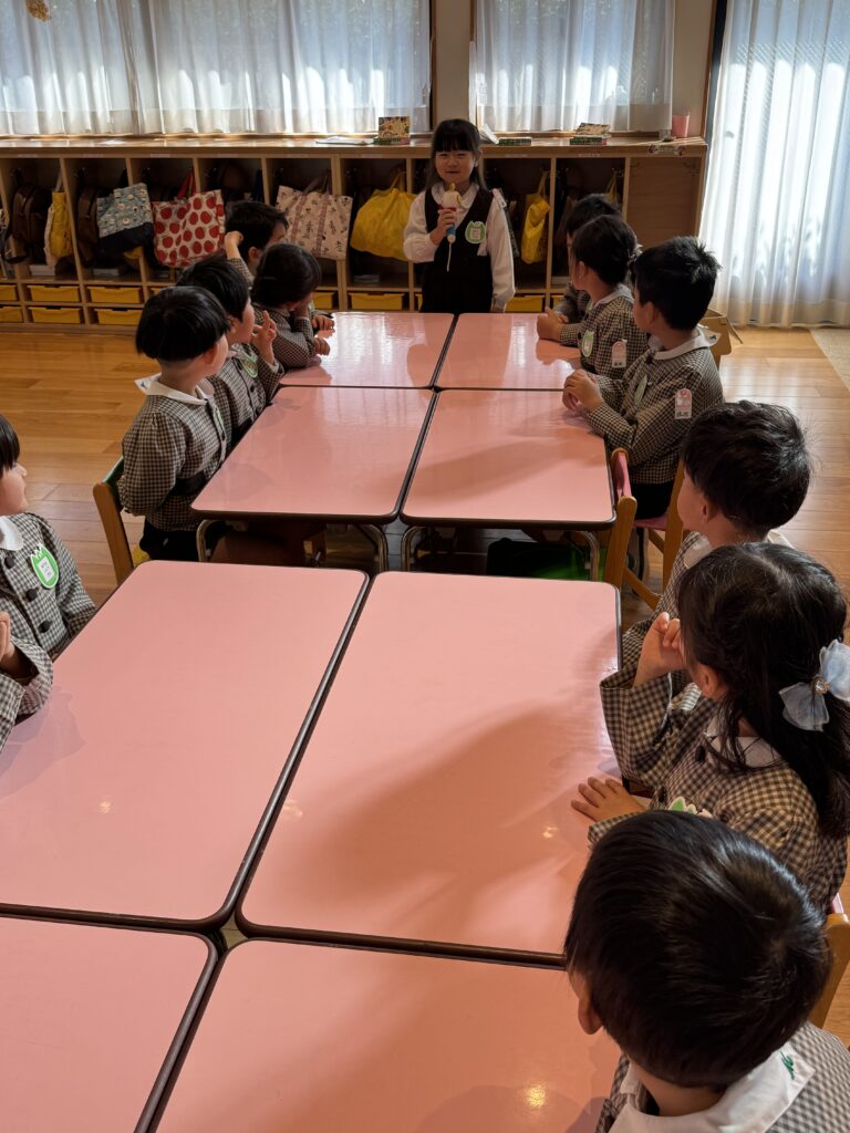 今日は2学期の終業式でした。園長先生からのお話があり、各クラスでは2学期楽しかったことや頑張ったことなど発表していました。